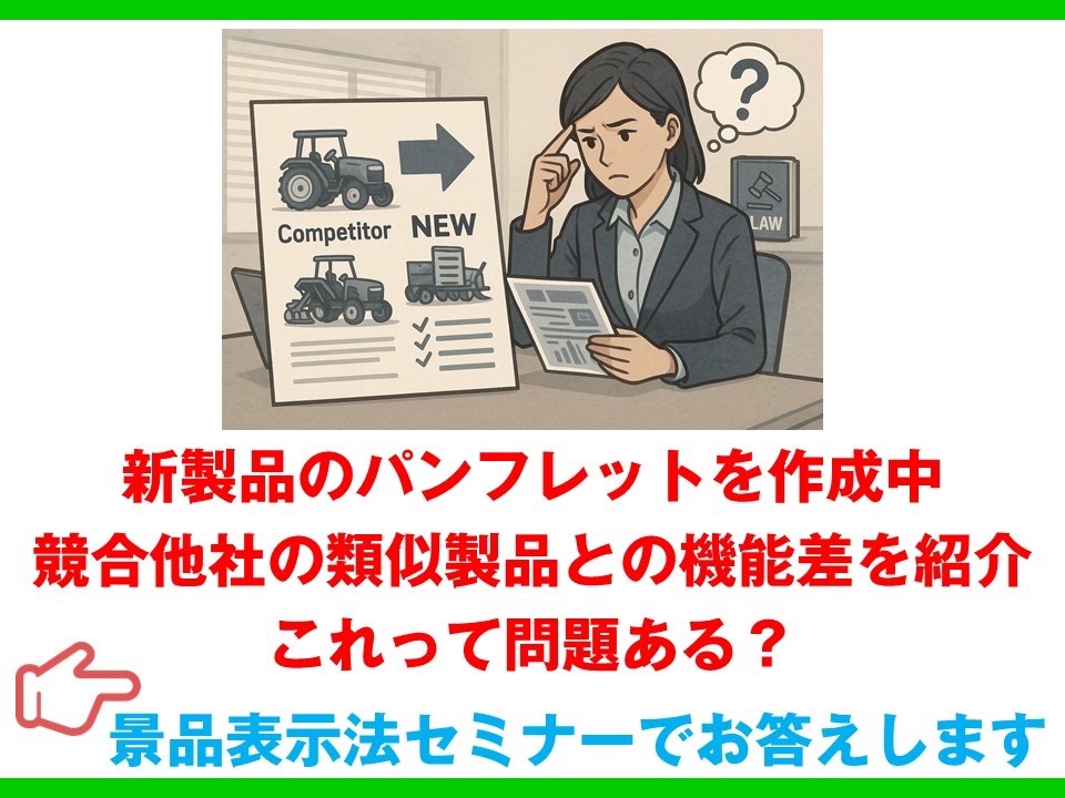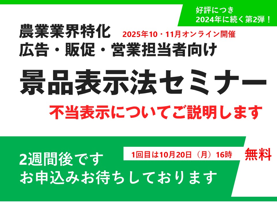 先日ご案内いたしました、景品表示法セミナー第2弾「不当表示について」の第1回目が2週間後に迫ってまいりました。