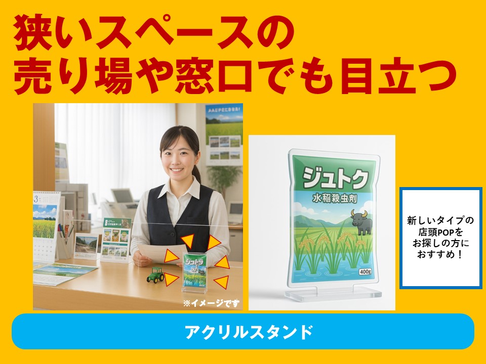 また、店頭に置くことができない劇物の農薬でも、アクリルスタンドであれば商品見本的に置くことができます。このように、商品への愛着、親近感を創出することに役立ちます。