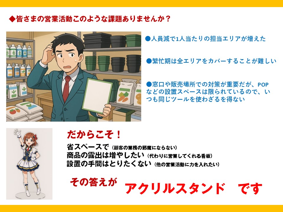 このようなメリットがあるアクリルスタンドですが、皆さまの営業活動の下記のような課題解決に役立つのでは、と考えています。