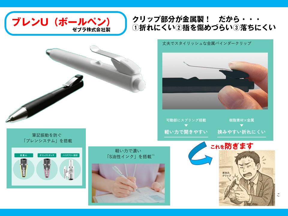 「販促品でもらったボールペンって、クリップの部分がすぐに折れてしまって、ポケットにさせなくなるし、指も痛くなるんだよね・・・」