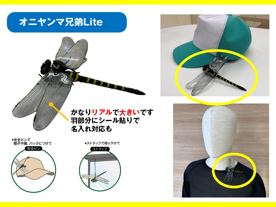 この「オニヤンマ兄弟Lite」は、そのオニヤンマそっくりなフィギュアを帽子やユニフォームなどに取り付けられるようにしたグッズです。