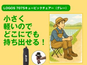 LOGOS 7075 キュービックチェアー(グレー) 作者: jutoku@staff投稿日: 2025年8月22日カテゴリー: 注目商品畳める小型チェアーは軽量かつ強度抜群の超々ジェラルミン製フレームを使っているため耐荷重約120kg。小さくて軽いのに使い勝手が良い一品。 【総重量】(約)300g【サイズ】(約)高さ210×幅205×奥行205mm【収納サイズ】(約)縦50×横275×高さ60mm【耐荷重】(約)120kg構成本体、収納袋【主素材】7075超々ジェラルミン、ポリエステル(PUコーティング) 下記の画像をクリックで、この商品のおすすめ活用方法の記事をお読みいただけます。ぜひご覧ください!投稿ナビゲーションキャンプス キルティングボアブランケットキャンプス 折りたたみラージバスケット